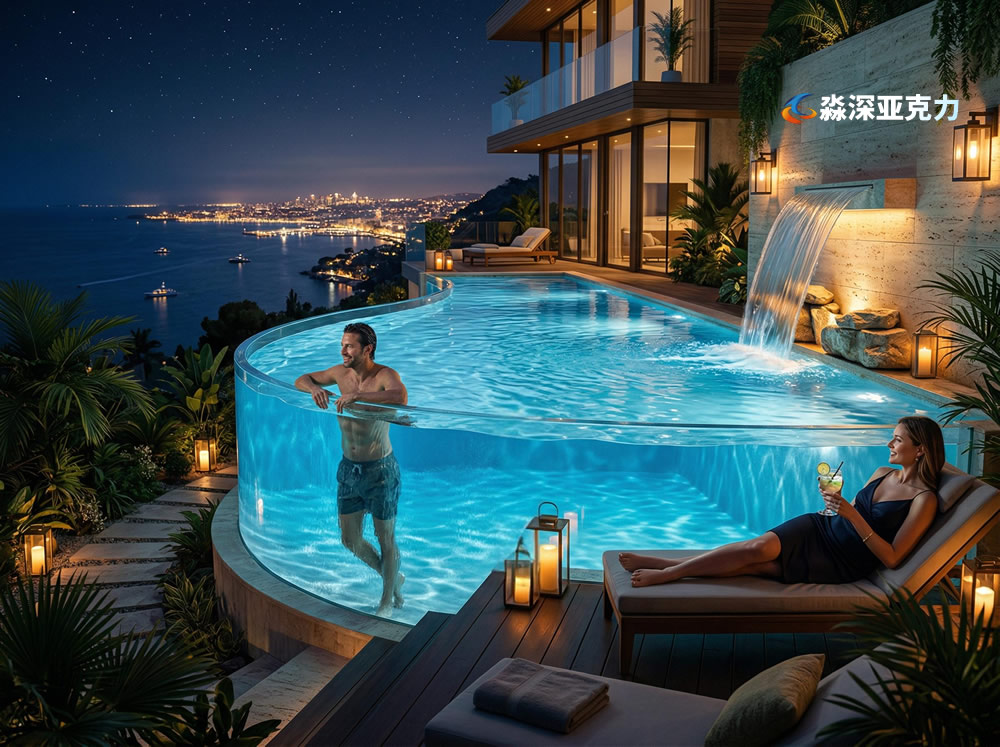 通体透明,浑然天成。池壁与池底均采用航空级亚克力,透光率高达93%。晴天时,阳光直透池底,波光粼粼洒在庭院地面;夜晚搭配水下灯光,整座泳池宛如一块发光的蓝宝石镶嵌在绿荫之中。
