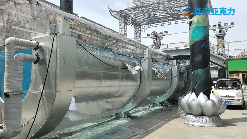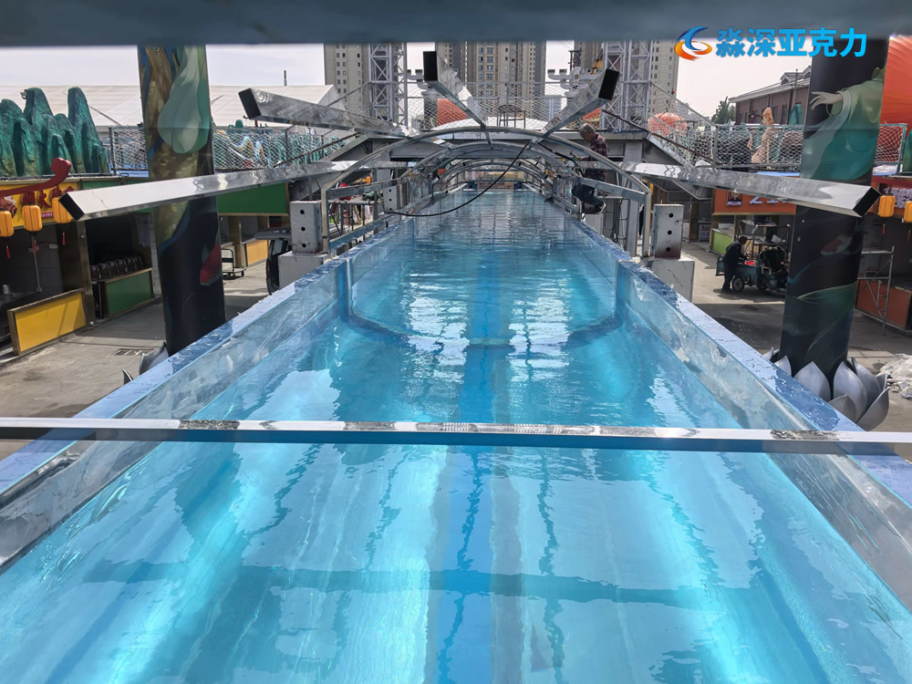 在中原的河南郑州,2026年4月,正在紧张的施工建设一个大型的亚克力美人鱼空中表演池,该表演池长度50米,宽度3米,深度2.2米,淼深亚克力施工团队日夜兼程,为万事大集夜市项目保驾护航。